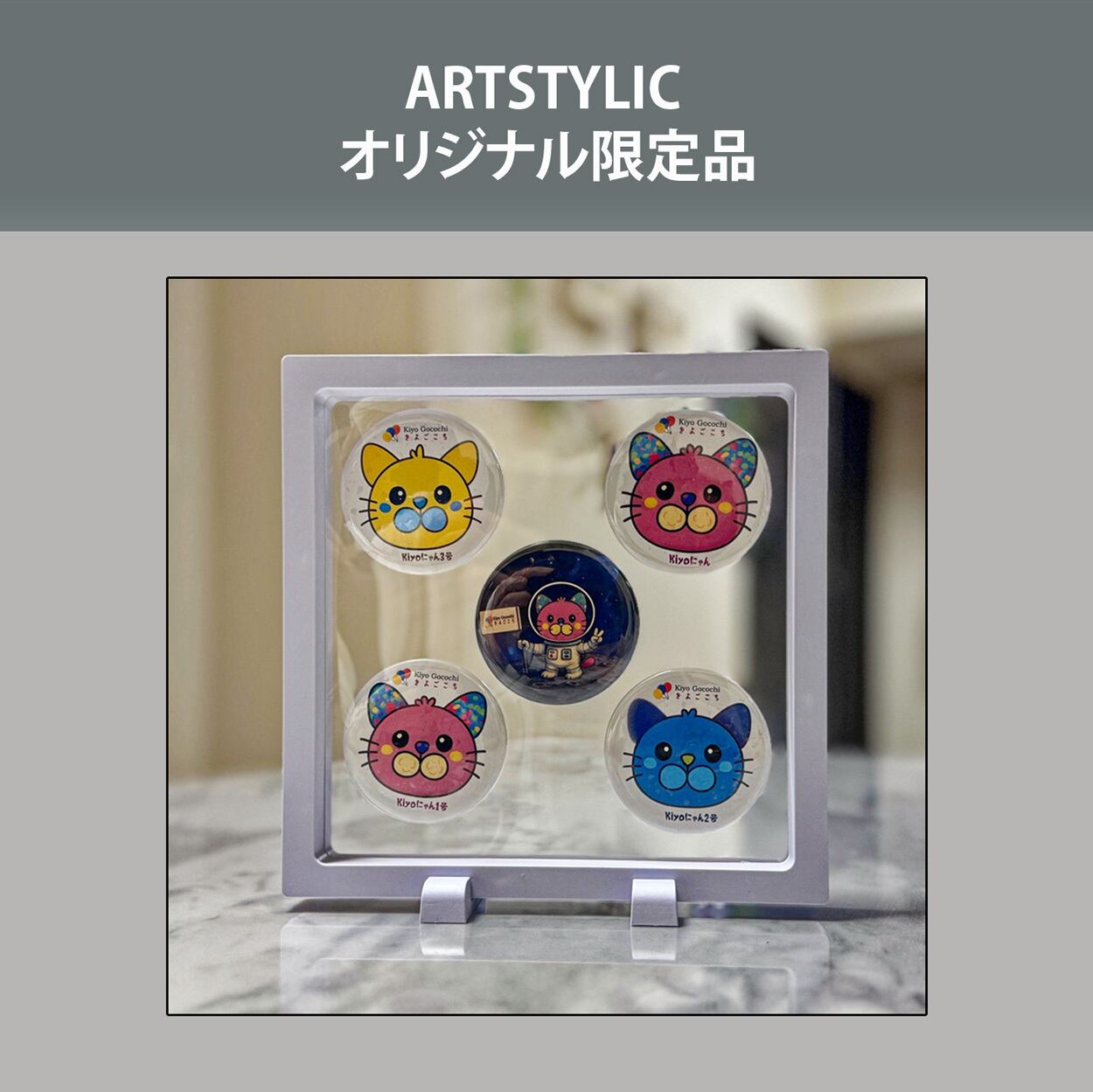 # Kiyoにゃんの円形57mm缶バッジ5個を使ったポップアートフレームセットの制作者「Artstylic編集長 RAM/8K」のサインを缶バッジ裏面に入れてフレームをボンドで接着したオリジナル限定作品としてお届け。