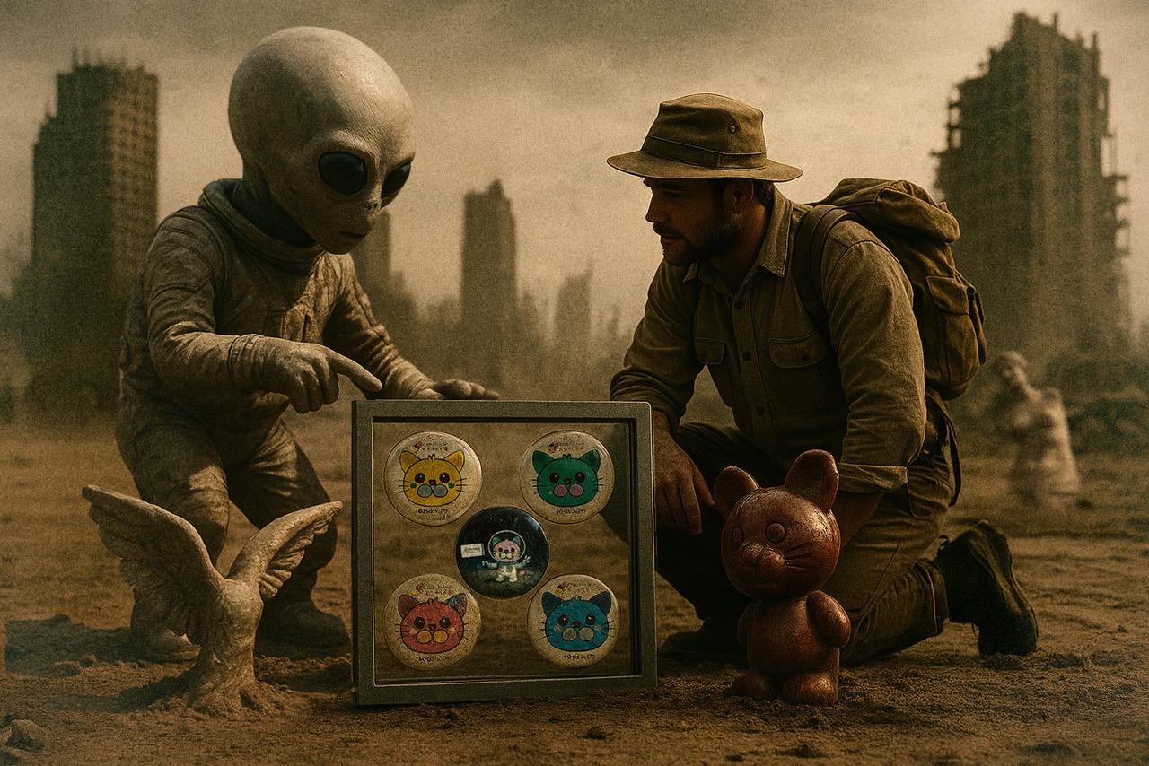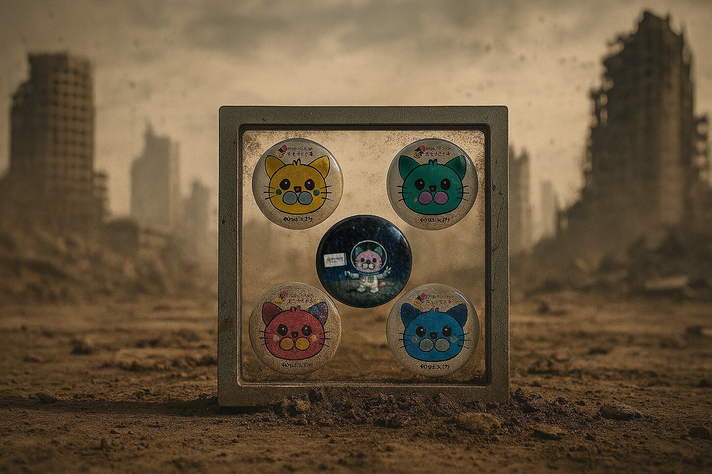 その周囲を囲む、4色の顔をしたKiyoにゃん缶バッジたち。