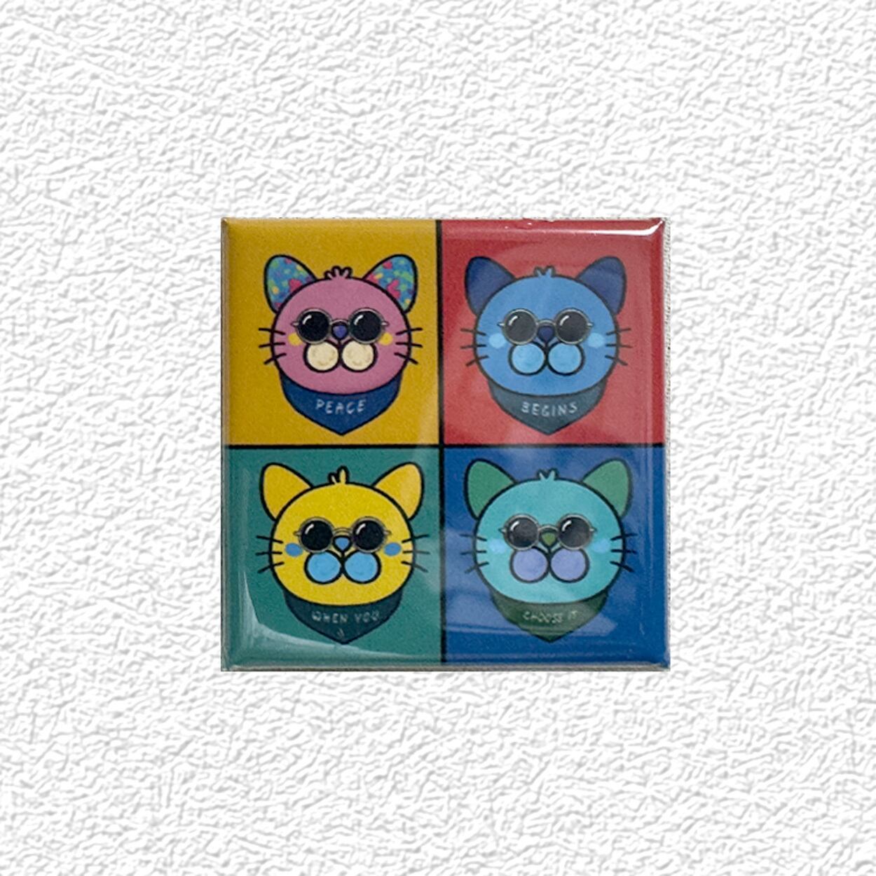 4匹のKiyoにゃんを1枚に収めた正方形のポップアート缶バッジをセットにしました。