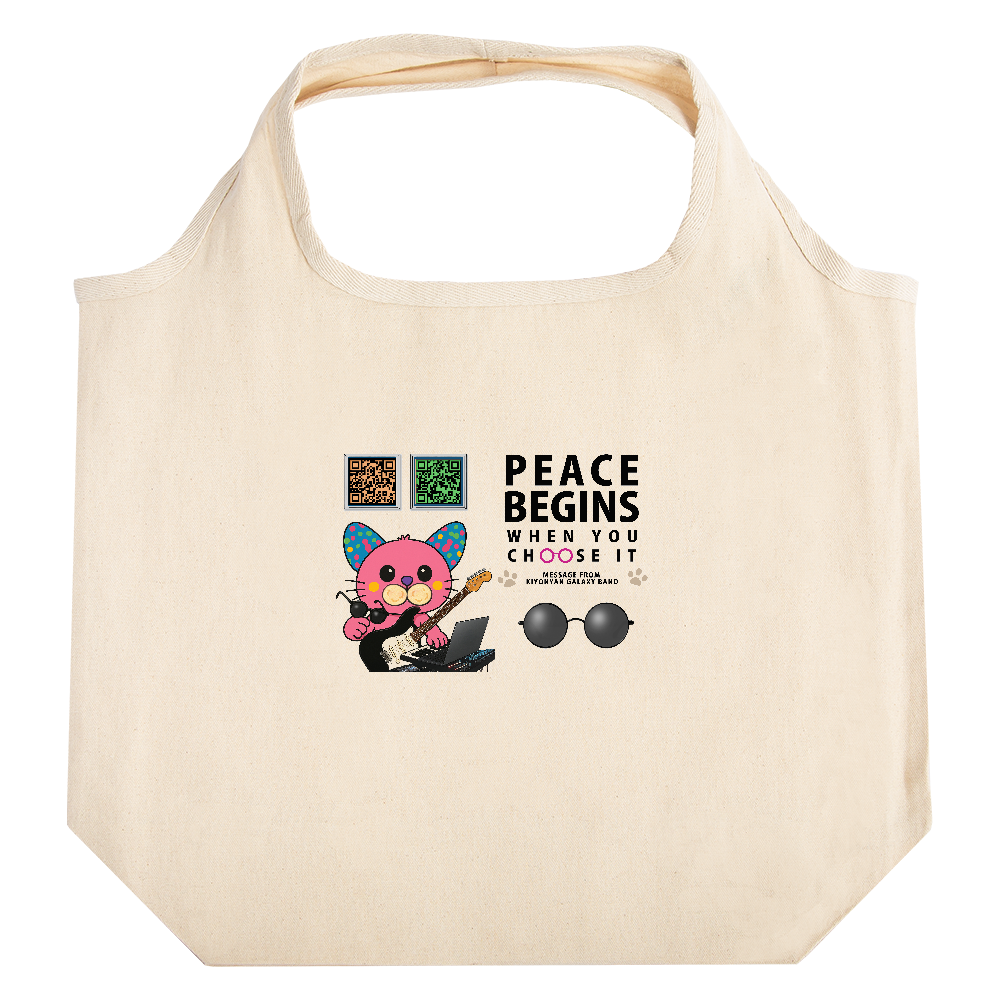 「PEACE BEGINS WHEN YOU CHOOSE IT」のメッセージと、ロックスターのKiyoにゃんがスタジオワークで作曲しているシーンをデザインした、たためるエコバッグです。